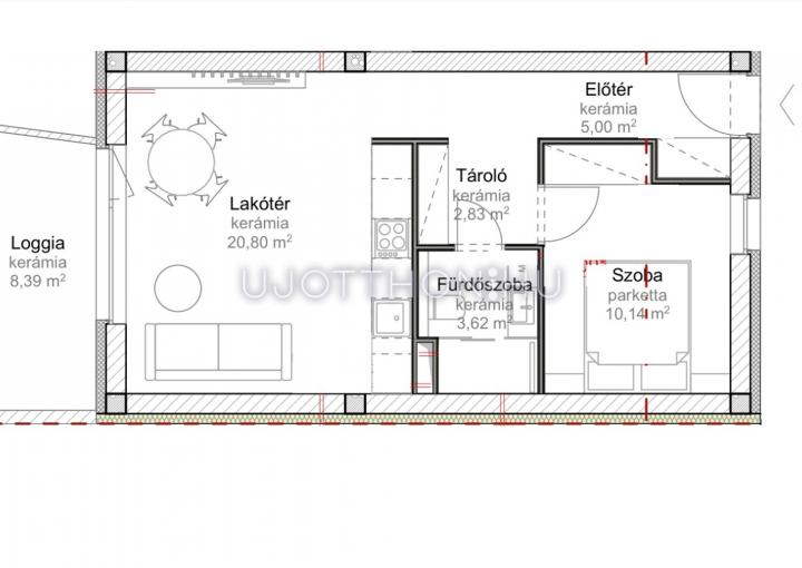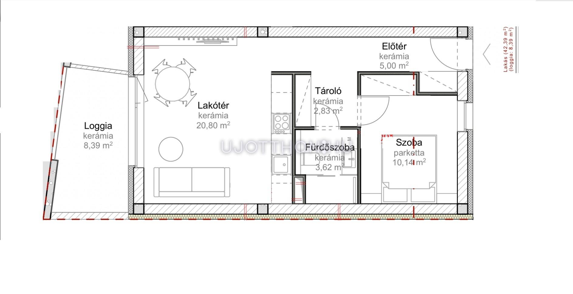 Ez az 3. emeleti lakás 42,39 nm-es, nappali-étkező-konyha +1 szobás, 8,39 nm-es loggiával.