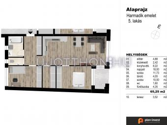 65 m2 alapterületű + 4 m2 erkély tartozik hozzá.
