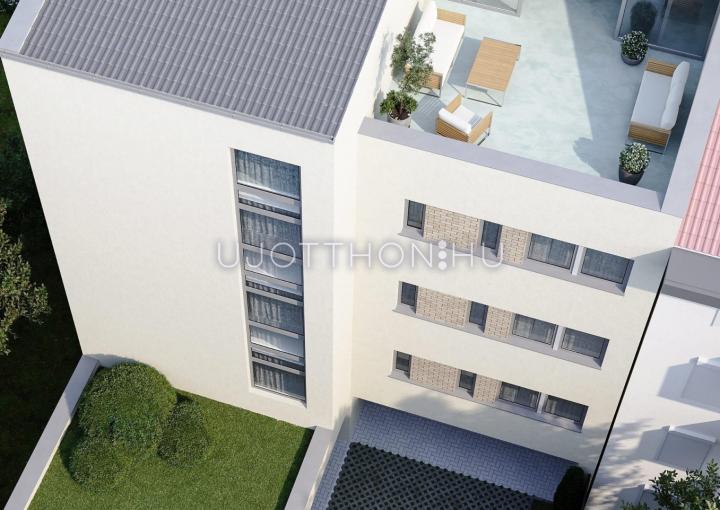Földszinten egy 33 m2 - es iroda + a gépkocsi parkolók kerülnek kialakításra, 1 - 2 - 3 emeleten szintenként 2 db lakás, + a 4. emeleten egy tetőtéri, nettó 70 m2 - es iroda kerül megépítésre.