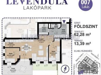 A lakás 62,12 m2, melyhez 13,39 m2-es terasz tartozik.