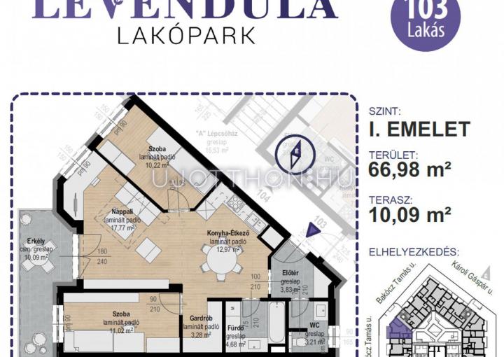 A lakás 66,98 m2, melyhez 10,09 m2-es terasz tartozik.