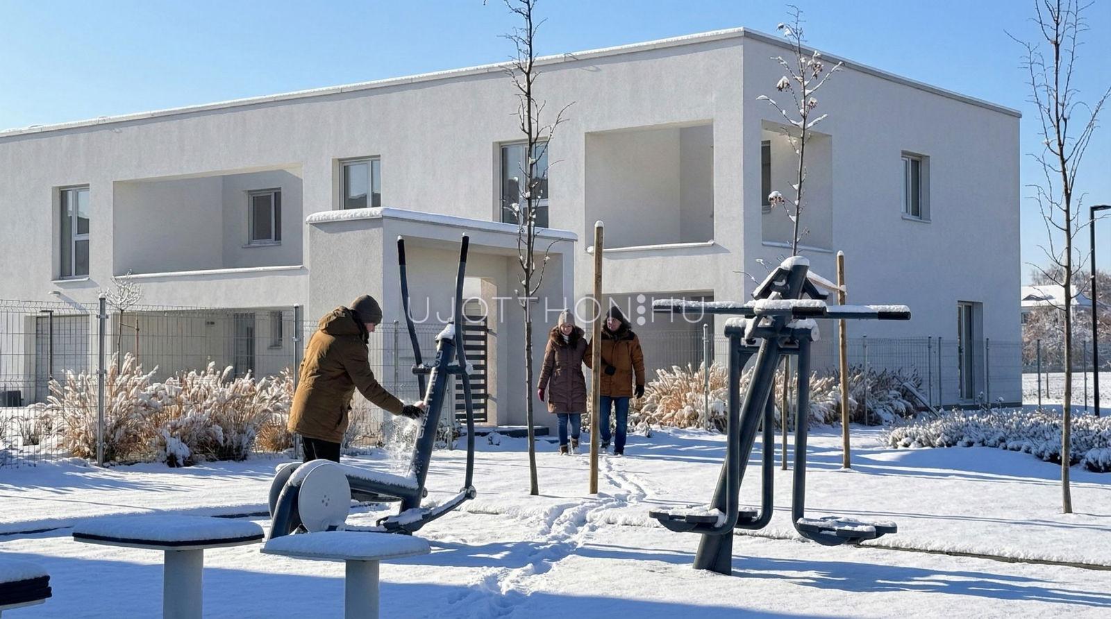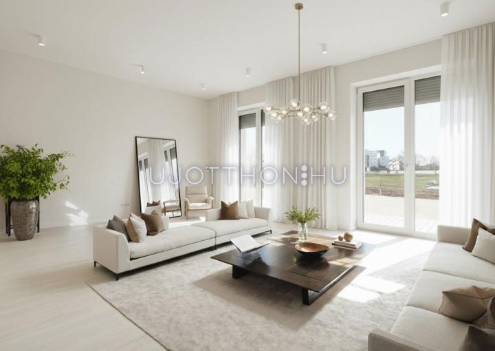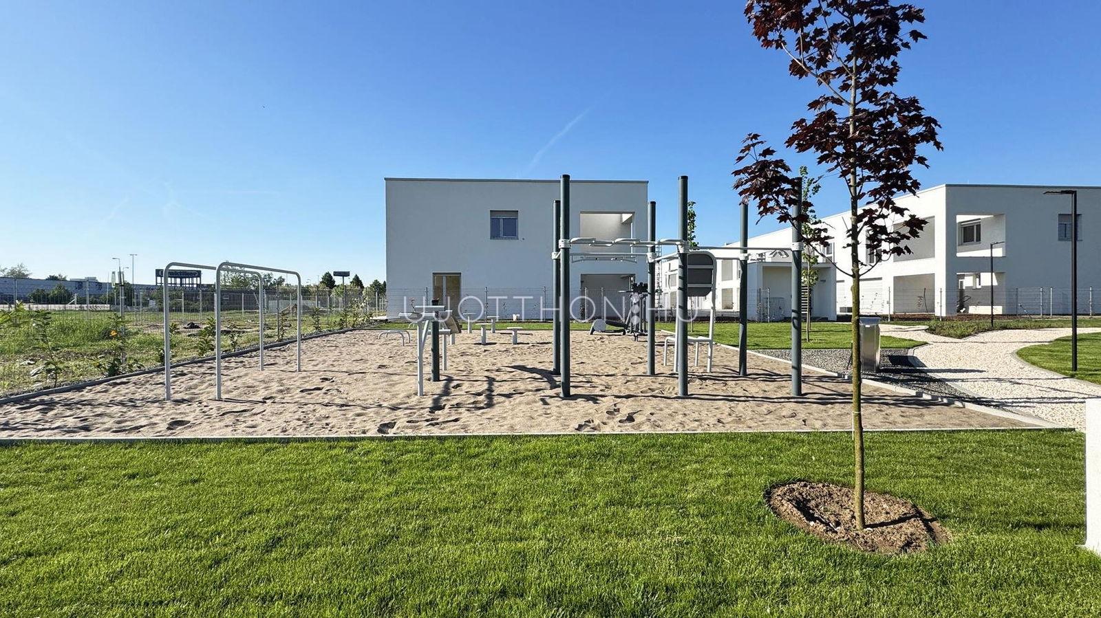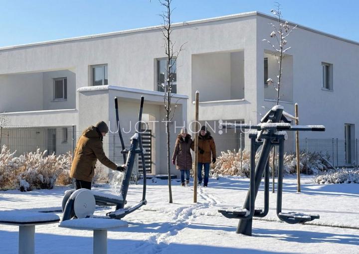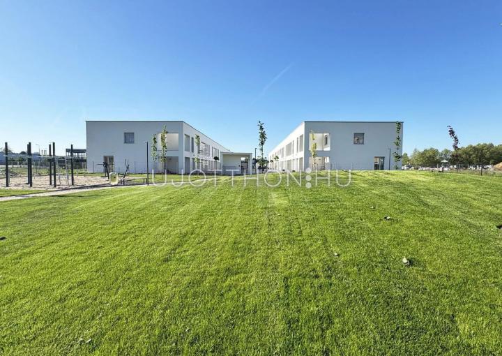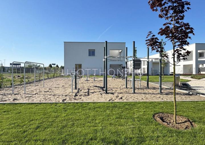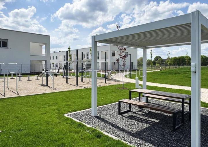 Új építésű, napfényes, nagy teraszos, hőszivattyús (padló hűtés, fűtés), alumínium motoros redőnyökkel, alacsony költségű sorházak és lakások parkos, biztonságos, zárt, zöld lakóparkban!
