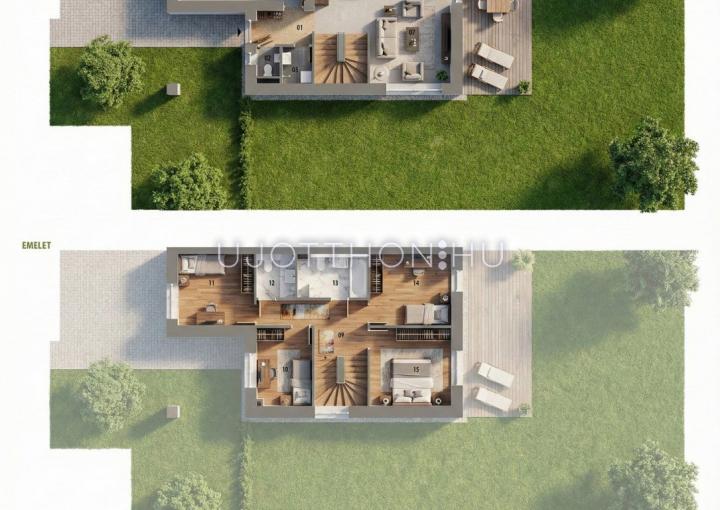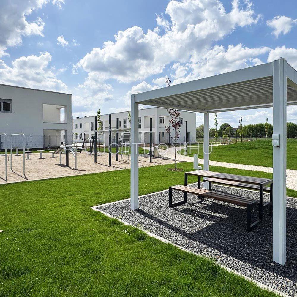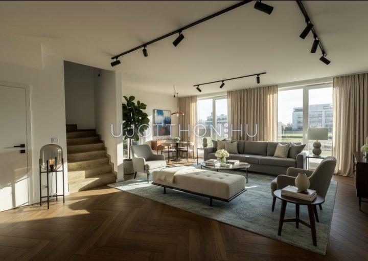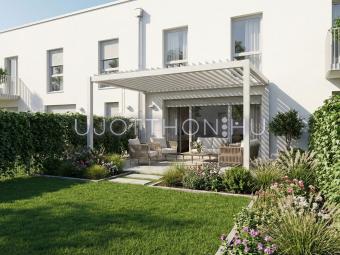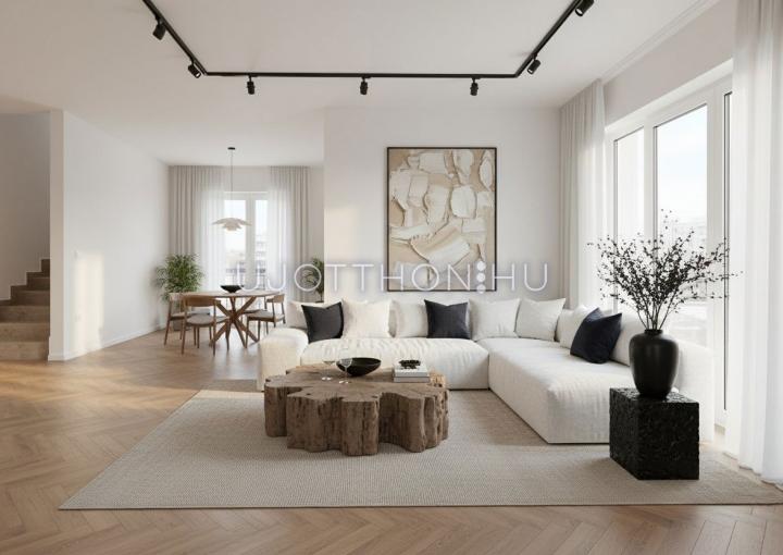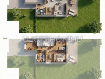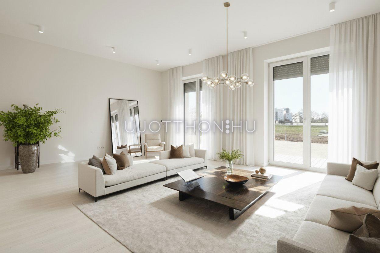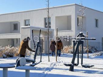 Új építésű, napfényes, nagy teraszos, hőszivattyús (padló hűtés, fűtés), alumínium motoros redőnyökkel, alacsony költségű sorházak és lakások parkos, biztonságos, zárt, zöld lakóparkban!