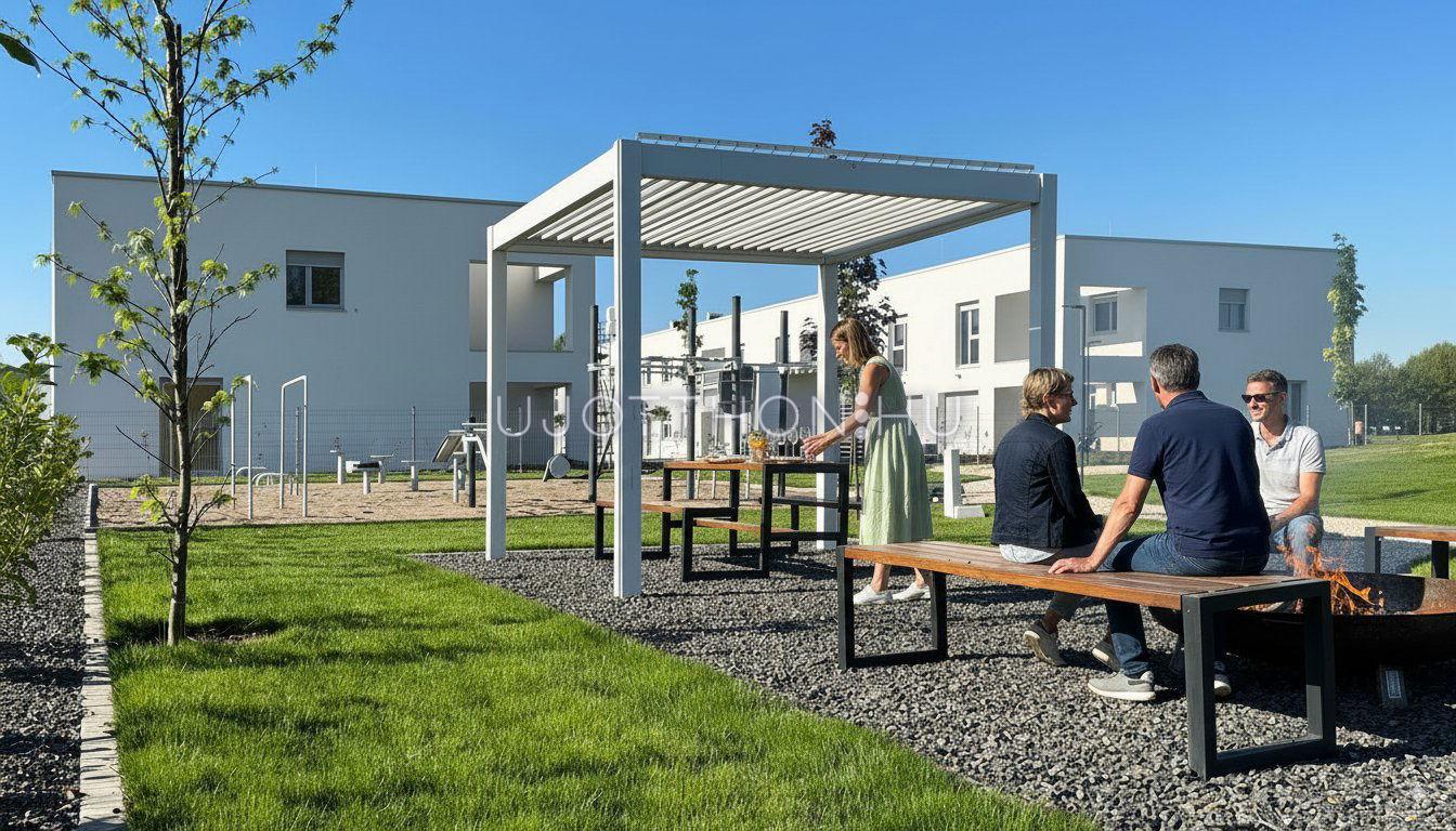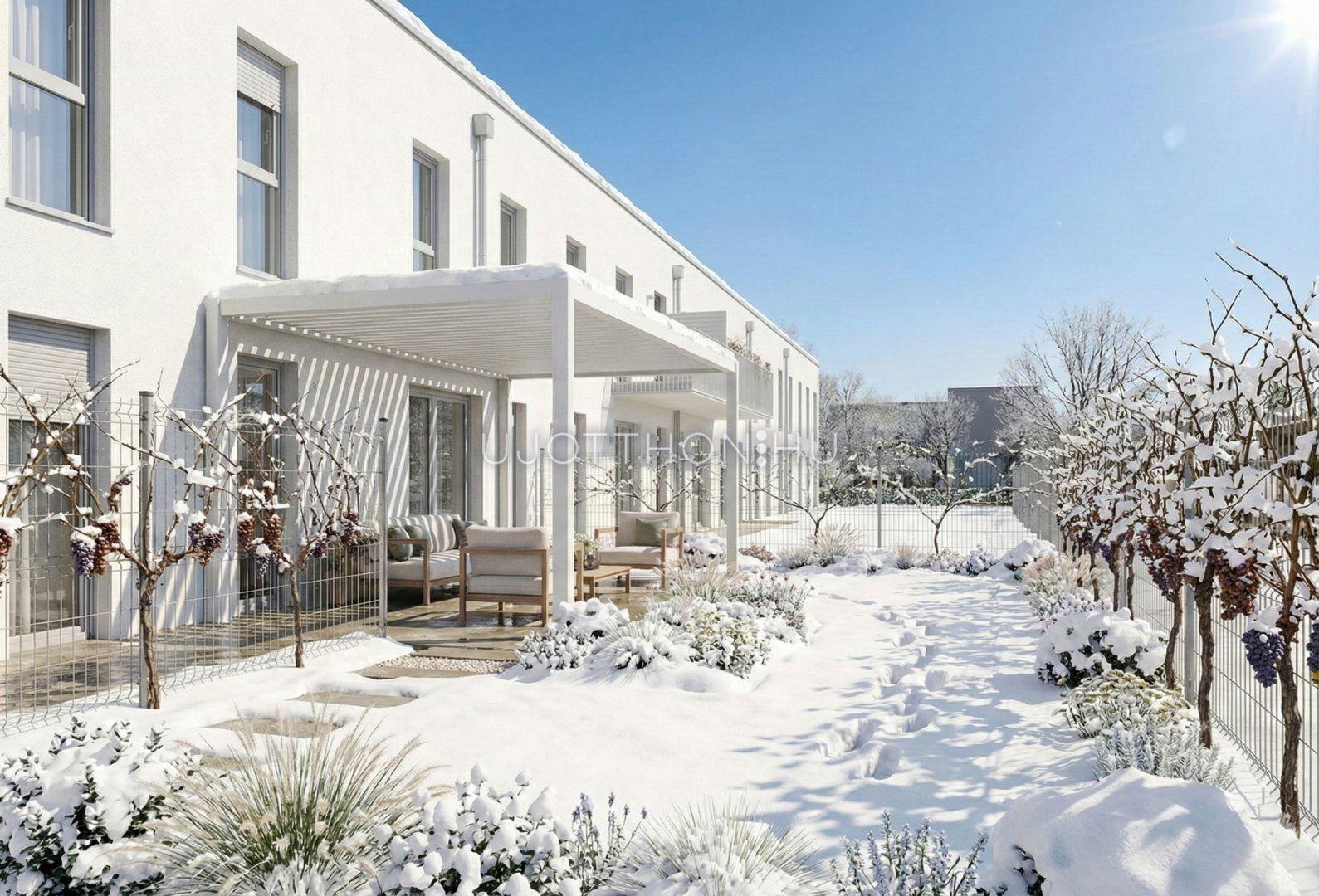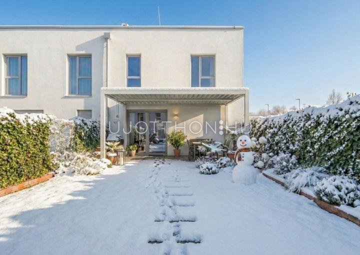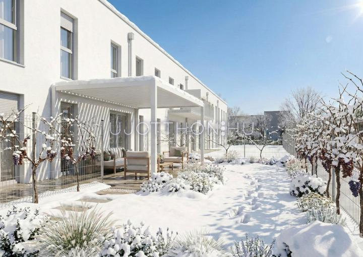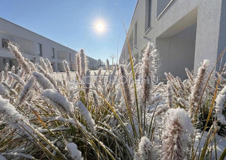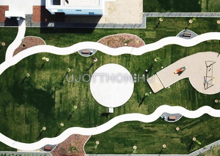 Új építésű, napfényes, nagy teraszos, hőszivattyús (padló hűtés, fűtés), alacsony költségű sorházak és lakások parkos, biztonságos, zárt, zöld lakóparkban!