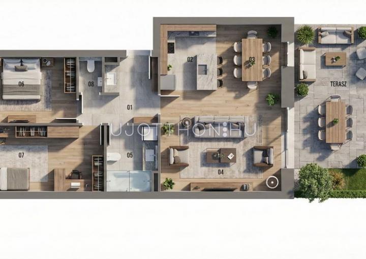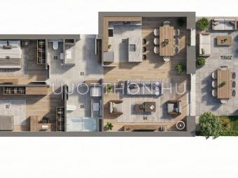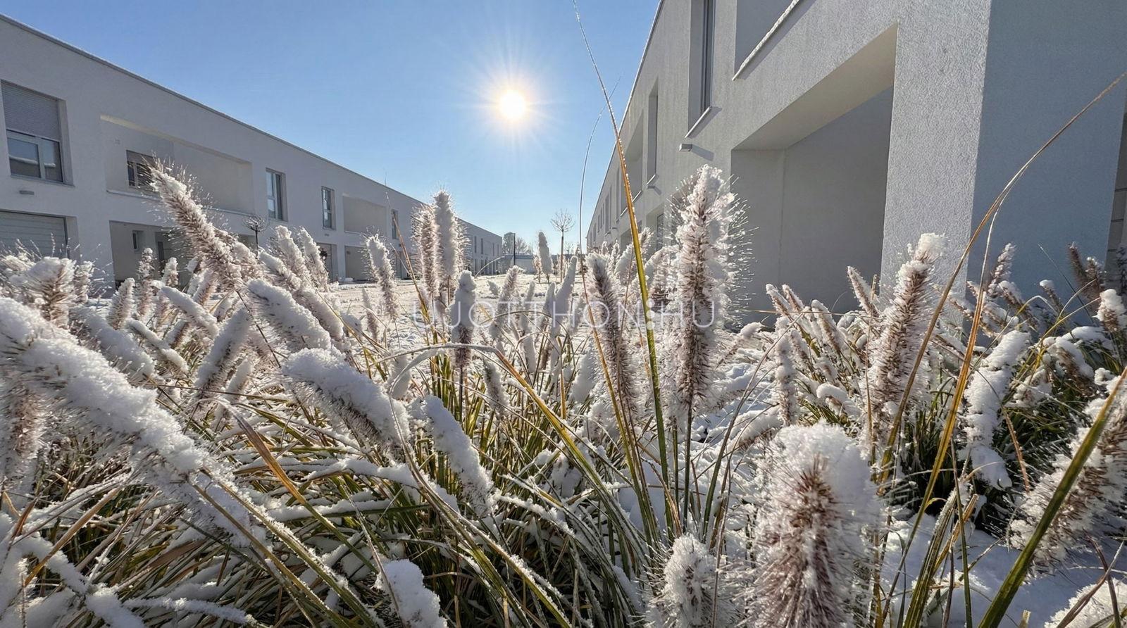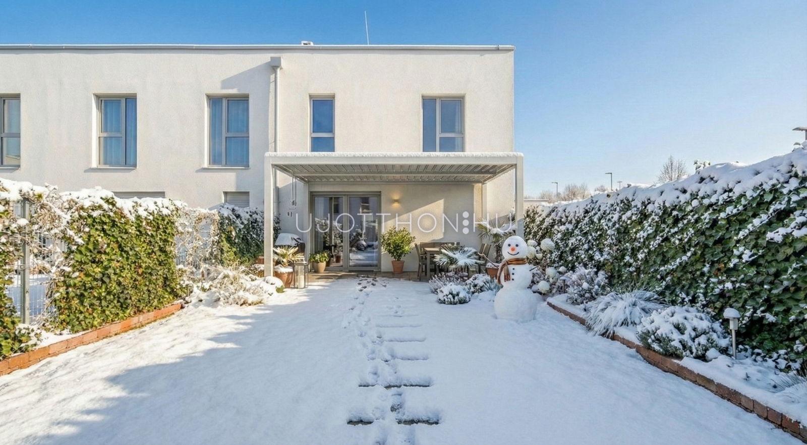 Új építésű, napfényes, nagy teraszos, hőszivattyús (padló hűtés, fűtés), alacsony költségű sorházak és lakások parkos, biztonságos, zárt, zöld lakóparkban!