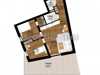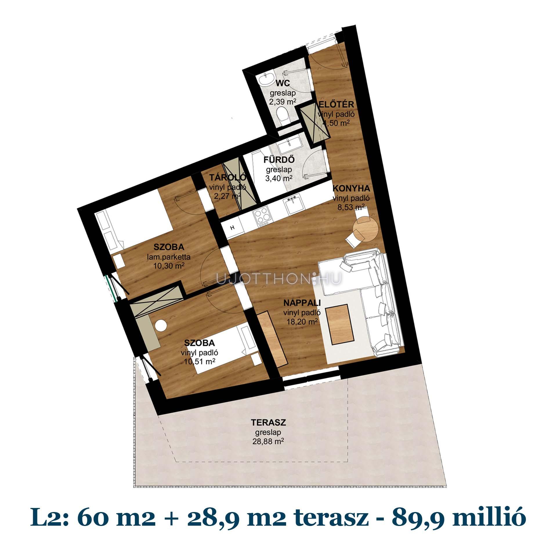 L2 Földszinti nappali és 2 hálószobás nagy 28,9 nm-es terasszal