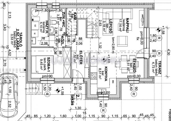 Földszinten: tágas nappali-étkező-konyha, hálószoba, fürdő, háztartási helyiség, kamra