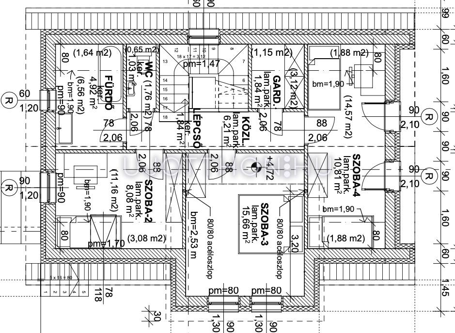 Emeleten: három hálószoba, gardrób és fürdőszoba
