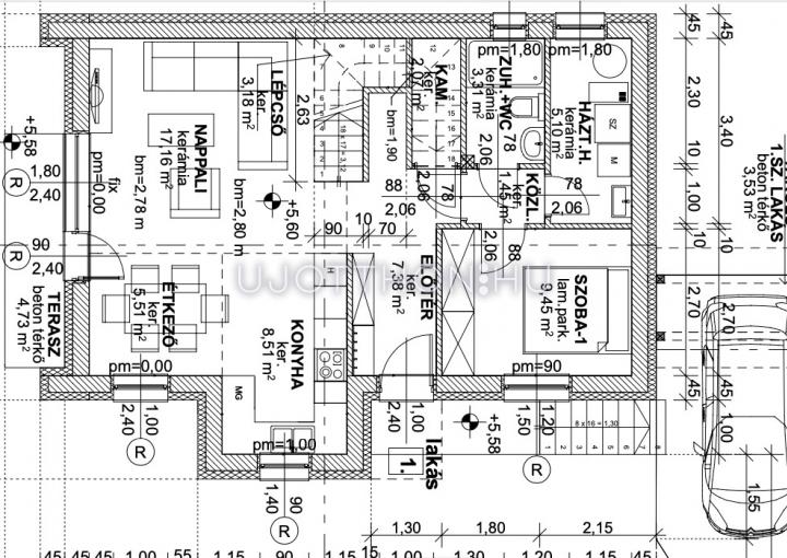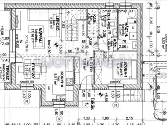 Földszinten: tágas nappali-étkező-konyha, hálószoba, fürdő, háztartási helyiség, kamra