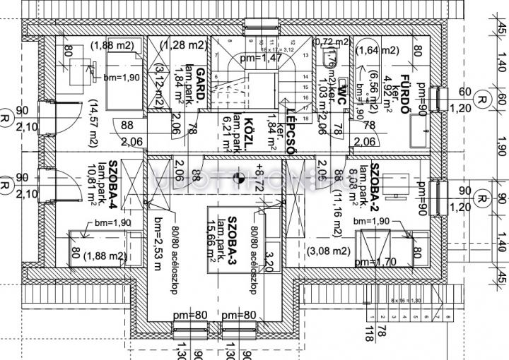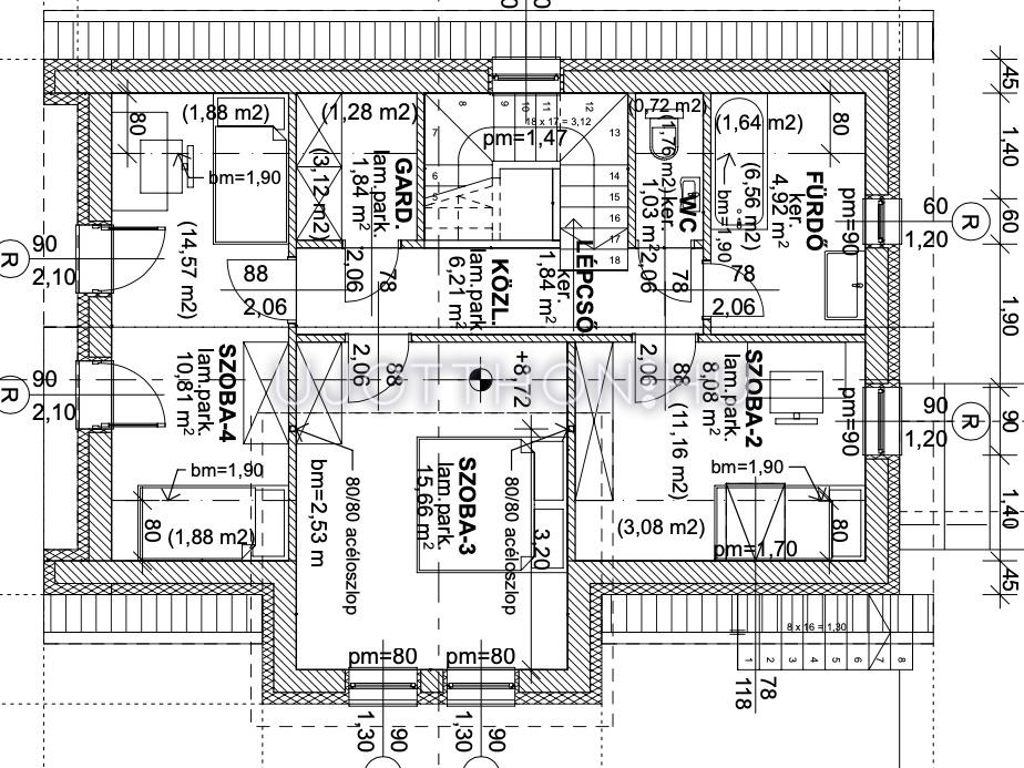 Emeleten: három hálószoba, gardrób és fürdőszoba