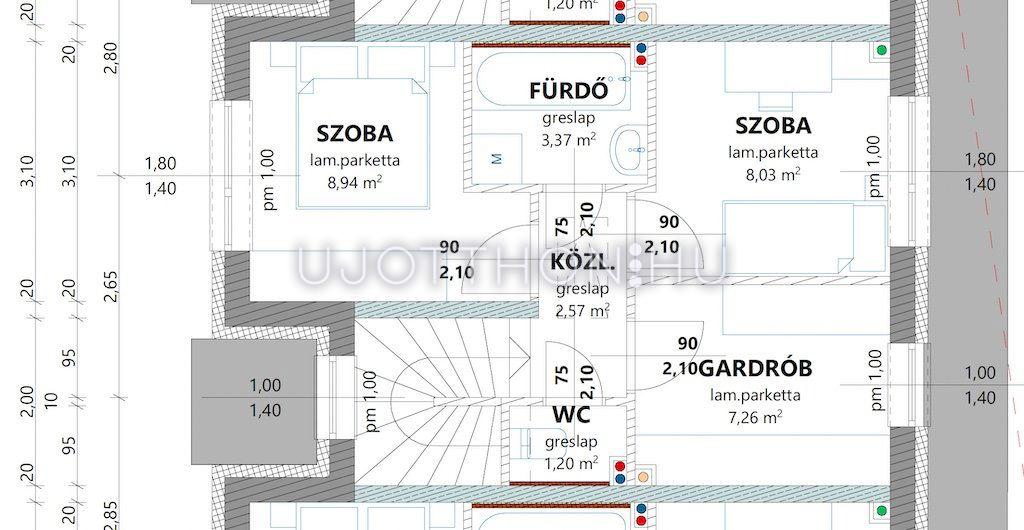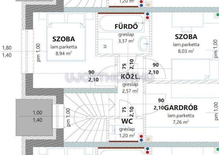 Az emeletre lépcsőn juthatunk fel, ahol 3 külön nyíló hálószoba, WC és a fürdőszoba helyezkedik el. A lépcsőfordulóban padlástér kialakítása.