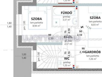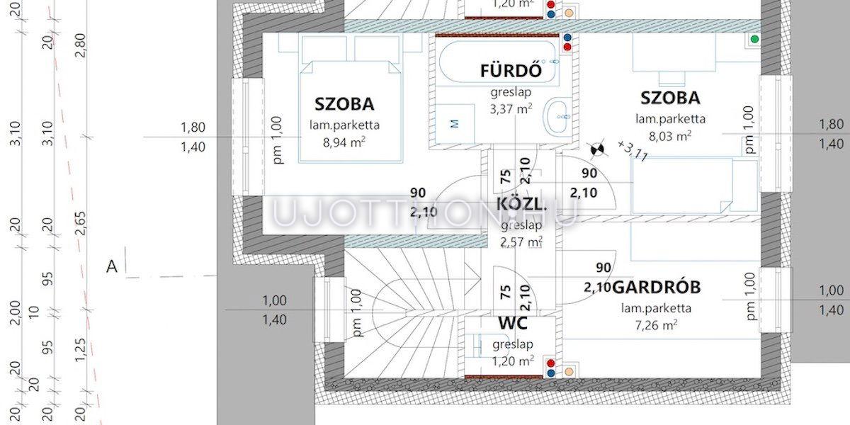Az emeletre lépcsőn juthatunk fel, ahol 3 külön nyíló hálószoba, WC és a fürdőszoba helyezkedik el. A lépcsőfordulóban padlástér kialakítása.