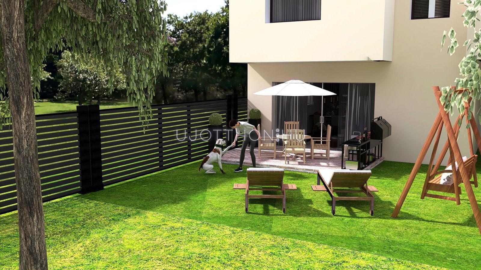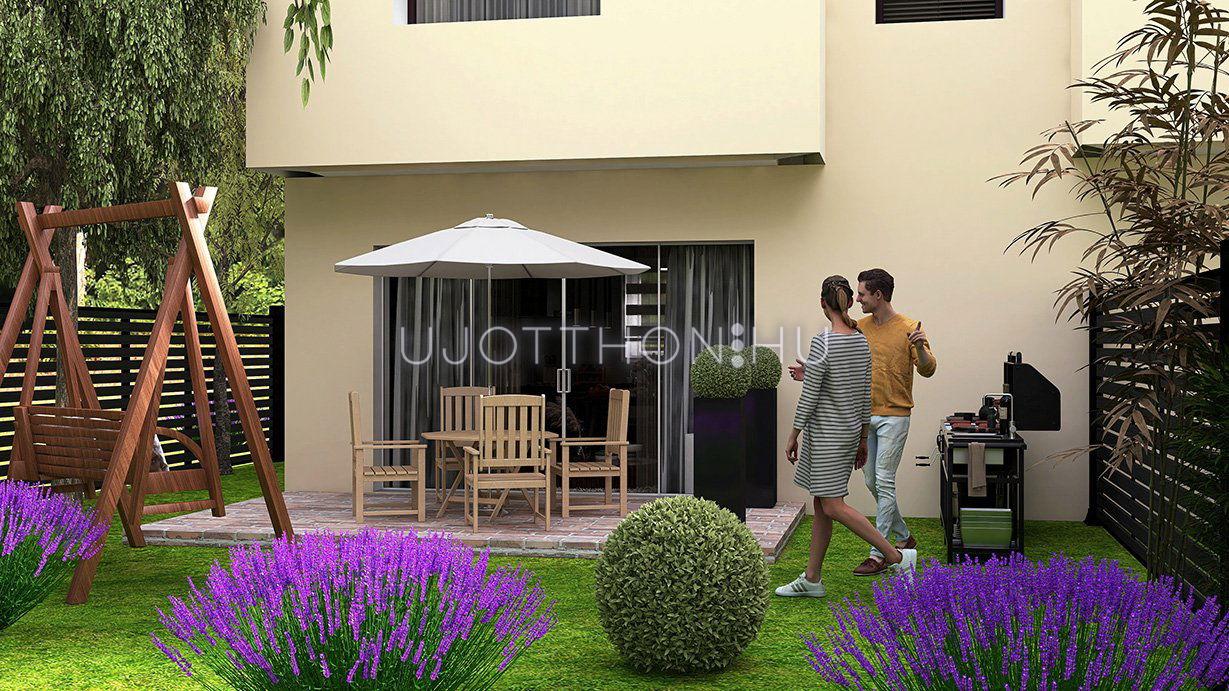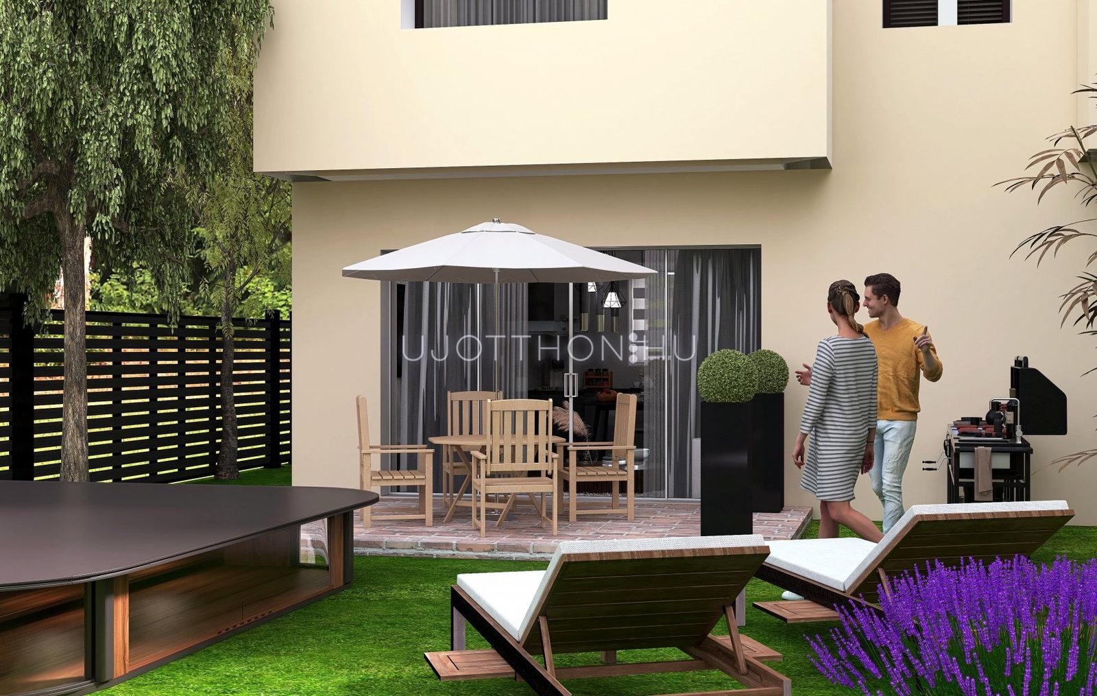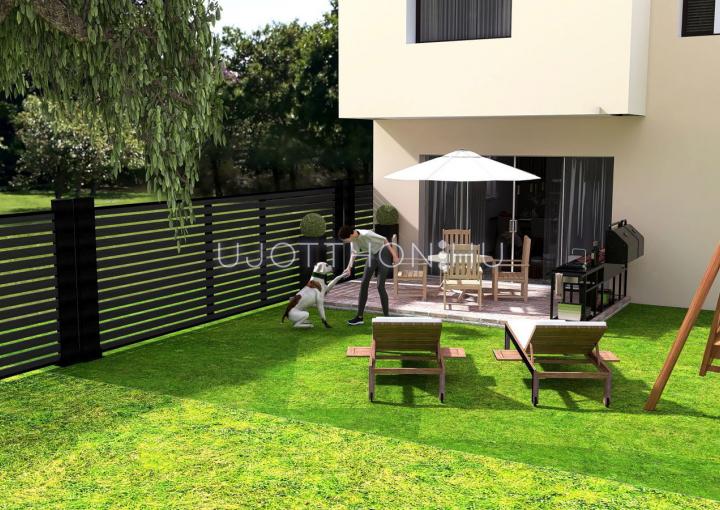 • Mindegyik lakáshoz tartozik saját kert/udvar. Némelyik lakásnak előkertje és oldalkertje is van. Az úgynevezett hátsó kertkapcsolat 180cm magas esztétikus kerítéssel körbe ölelt privát terület. A nappaliból lehet megközelíteni, kialakított teraszon keresztül.