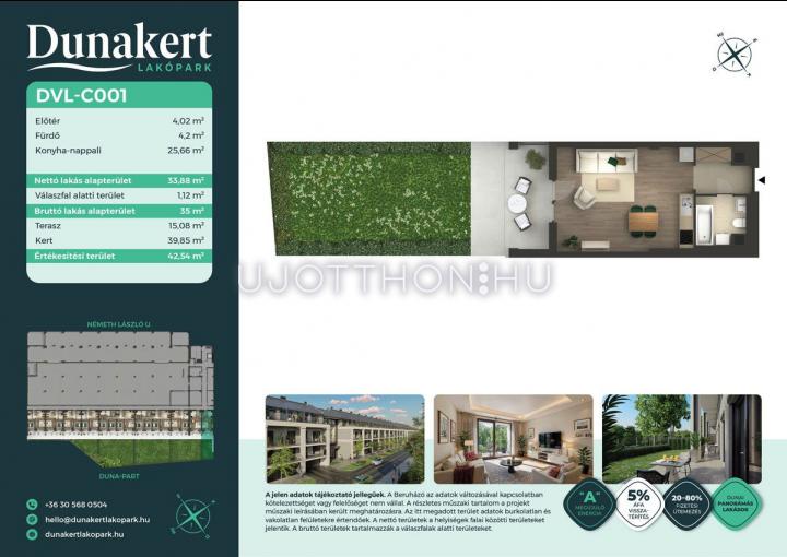 A Dunakert Lakópark Vác északi részén, a Németh László utcában épül, egy csendes, rendezett városrészben, közvetlenül a Duna-part mellett. A négyszintes épületben 152 modern, energiahatékony lakás kap helyet. A praktikus stúdióktól a nappali + több hálószobás családi otthonokig. Az emeleti lakásokhoz tágas terasz, a földszintiekhez saját kert tartozik, így minden lakó számára biztosított a privát kültéri tér és a természetkapcsolat.
