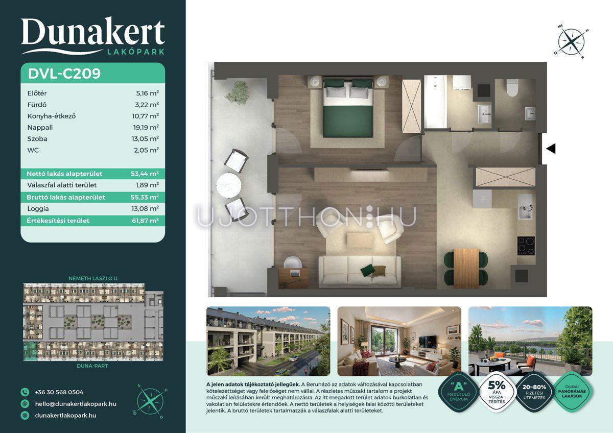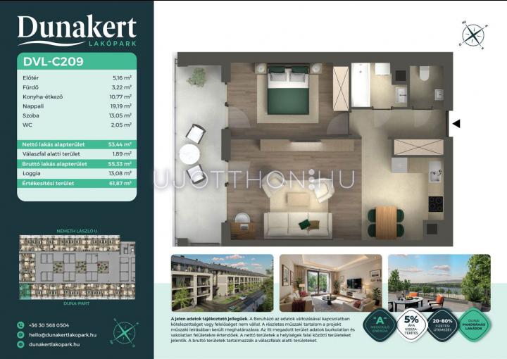 A Dunakert Lakópark Vác északi részén, a Németh László utcában épül, egy csendes, rendezett városrészben, közvetlenül a Duna-part mellett. A négyszintes épületben 152 modern, energiahatékony lakás kap helyet. A praktikus stúdióktól a nappali + több hálószobás családi otthonokig. Az emeleti lakásokhoz tágas terasz, a földszintiekhez saját kert tartozik, így minden lakó számára biztosított a privát kültéri tér és a természetkapcsolat.