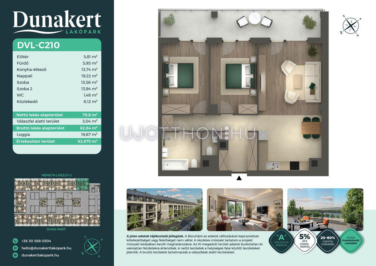 A Dunakert Lakópark Vác északi részén, a Németh László utcában épül, egy csendes, rendezett városrészben, közvetlenül a Duna-part mellett. A négyszintes épületben 152 modern, energiahatékony lakás kap helyet. A praktikus stúdióktól a nappali + több hálószobás családi otthonokig. Az emeleti lakásokhoz tágas terasz, a földszintiekhez saját kert tartozik, így minden lakó számára biztosított a privát kültéri tér és a természetkapcsolat.