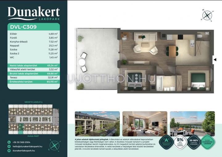 A Dunakert Lakópark Vác északi részén, a Németh László utcában épül, egy csendes, rendezett városrészben, közvetlenül a Duna-part mellett. A négyszintes épületben 152 modern, energiahatékony lakás kap helyet. A praktikus stúdióktól a nappali + több hálószobás családi otthonokig. Az emeleti lakásokhoz tágas terasz, a földszintiekhez saját kert tartozik, így minden lakó számára biztosított a privát kültéri tér és a természetkapcsolat.