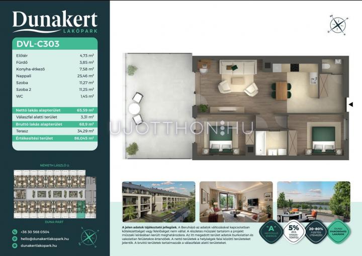 A Dunakert Lakópark Vác északi részén, a Németh László utcában épül, egy csendes, rendezett városrészben, közvetlenül a Duna-part mellett. A négyszintes épületben 152 modern, energiahatékony lakás kap helyet. A praktikus stúdióktól a nappali + több hálószobás családi otthonokig. Az emeleti lakásokhoz tágas terasz, a földszintiekhez saját kert tartozik, így minden lakó számára biztosított a privát kültéri tér és a természetkapcsolat.