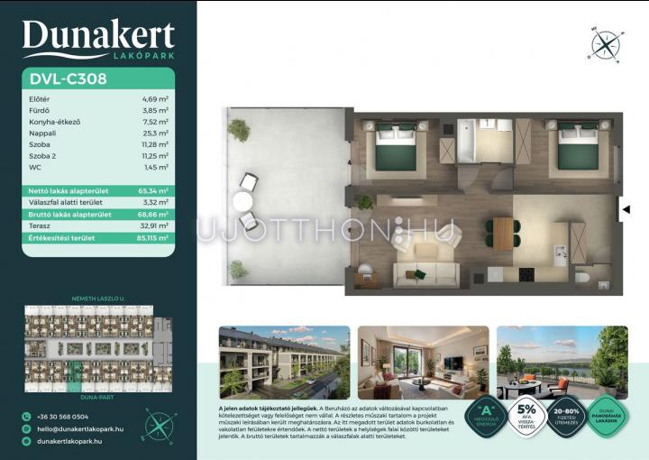 A Dunakert Lakópark Vác északi részén, a Németh László utcában épül, egy csendes, rendezett városrészben, közvetlenül a Duna-part mellett. A négyszintes épületben 152 modern, energiahatékony lakás kap helyet. A praktikus stúdióktól a nappali + több hálószobás családi otthonokig. Az emeleti lakásokhoz tágas terasz, a földszintiekhez saját kert tartozik, így minden lakó számára biztosított a privát kültéri tér és a természetkapcsolat.