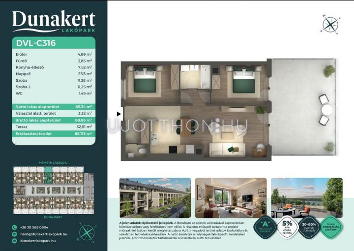 A Dunakert Lakópark Vác északi részén, a Németh László utcában épül, egy csendes, rendezett városrészben, közvetlenül a Duna-part mellett. A négyszintes épületben 152 modern, energiahatékony lakás kap helyet. A praktikus stúdióktól a nappali + több hálószobás családi otthonokig. Az emeleti lakásokhoz tágas terasz, a földszintiekhez saját kert tartozik, így minden lakó számára biztosított a privát kültéri tér és a természetkapcsolat.