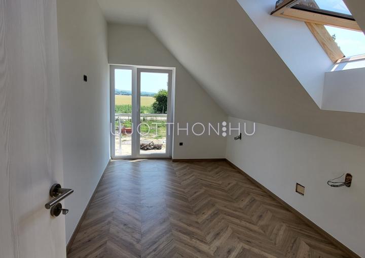 - 71 nm-es. Földszintjén konyha, WC, étkező, kertkapcsolatos nappalival. Tetőtérben 2 háló, fürdő+WC,és gardrób.