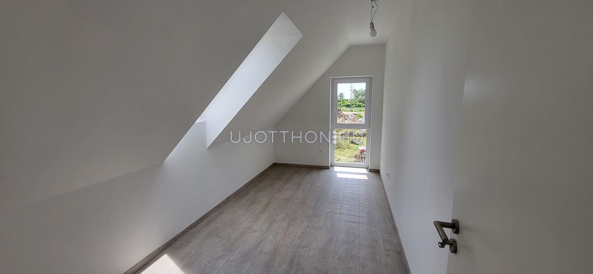 - 96 nm-es. Földszinten 1 háló, konyha-étkező, kertkapcsolatos nappali, fürdő+WC és tároló. Tetőtérben 2 háló, dolgozószoba, és fürdő.