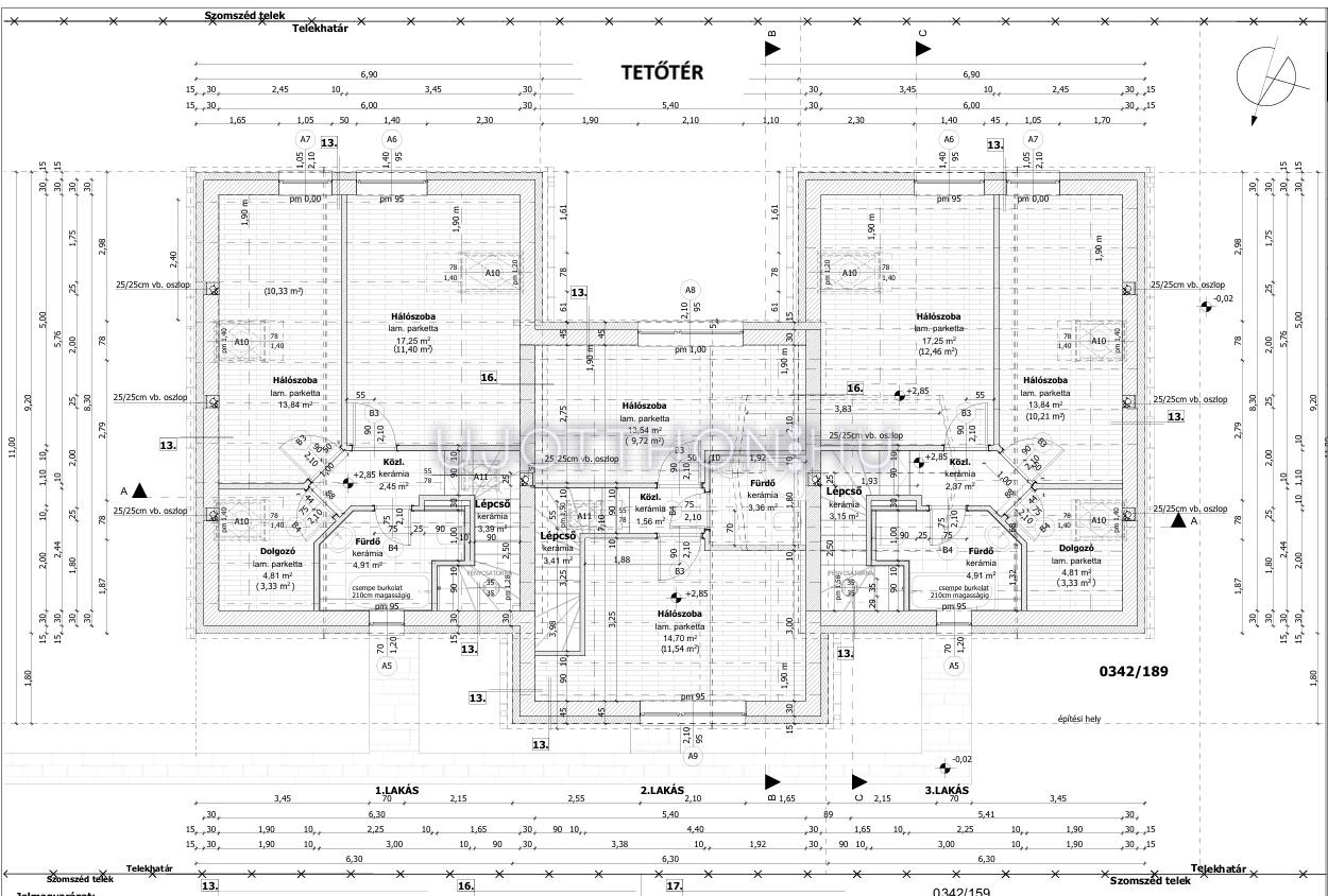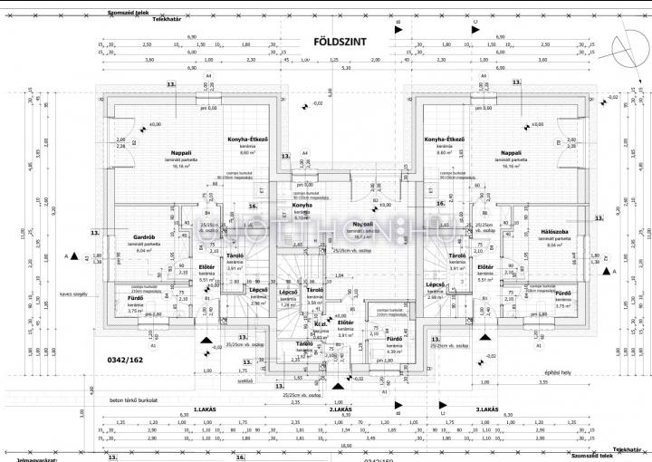 A háromlakásos sorház két szélső lakása 96-96 nm, a középső lakás pedig 73 nm alapterületű.