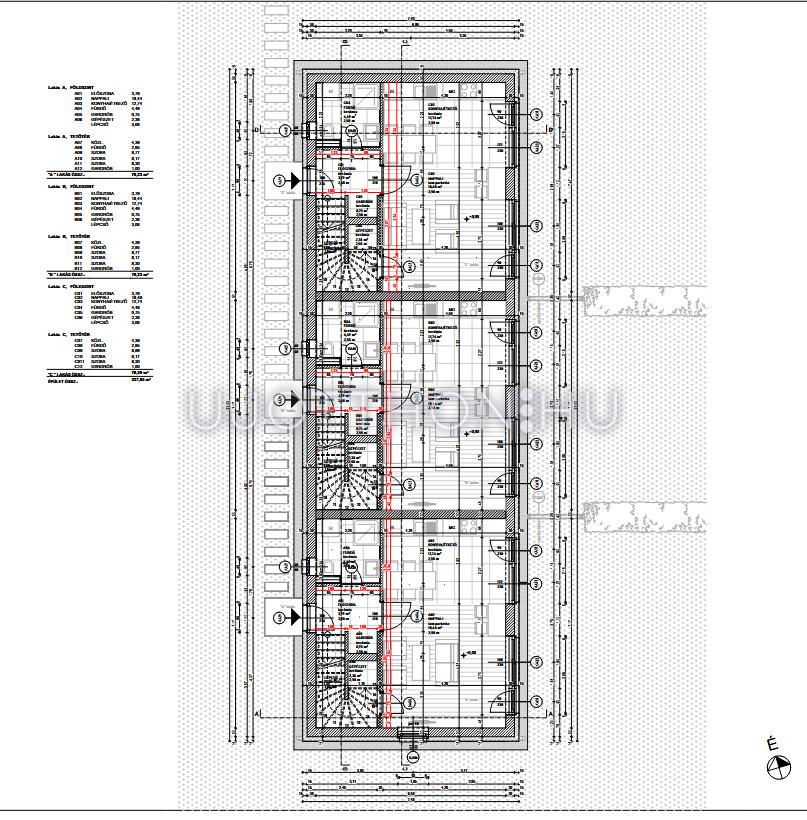 A 600-800 nm-es telken 3 db lakás található eltérő méretű saját használatú kerttel és kocsibeállóval.