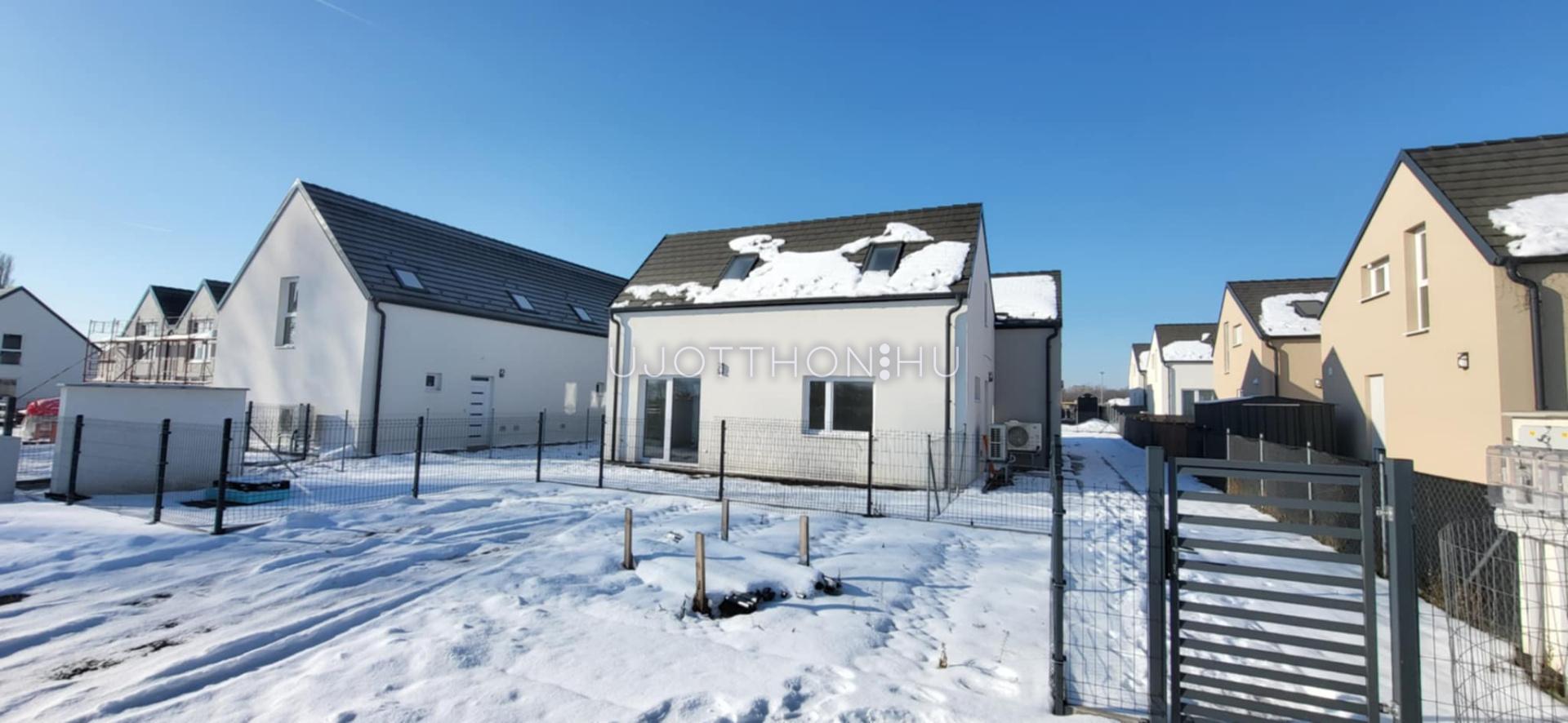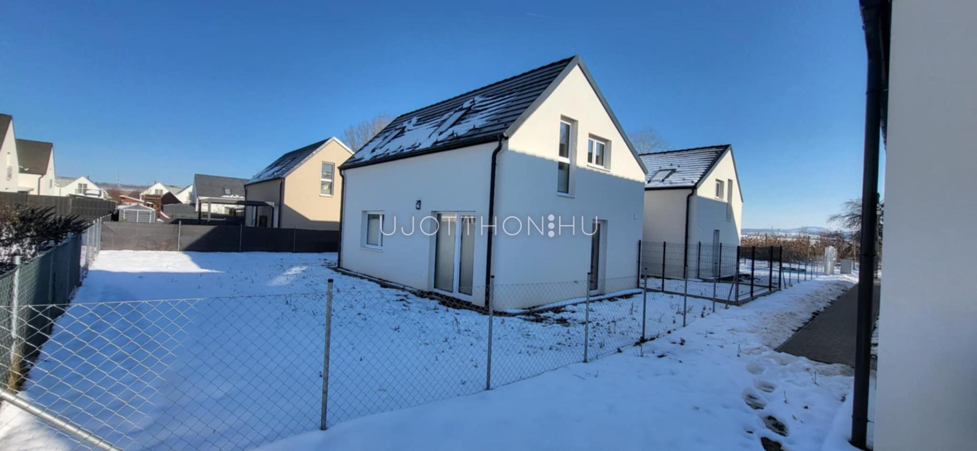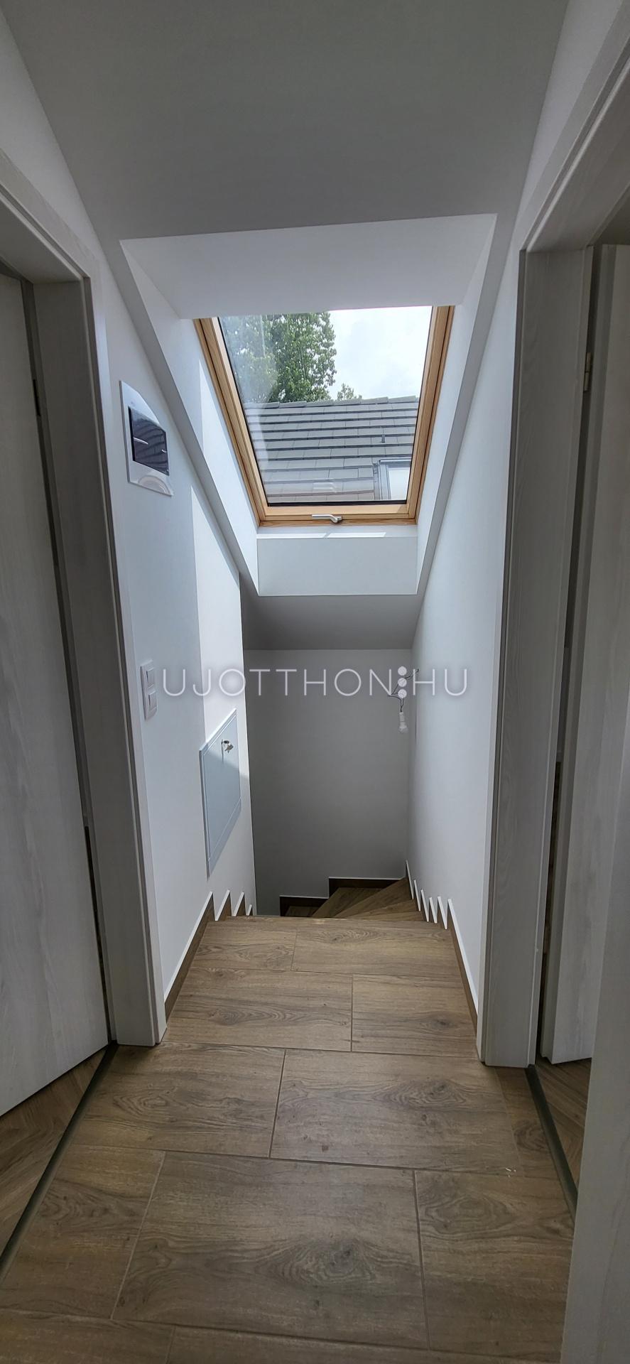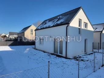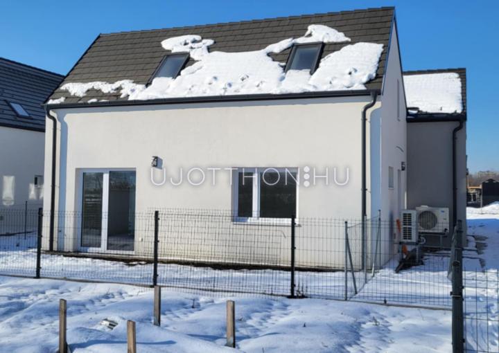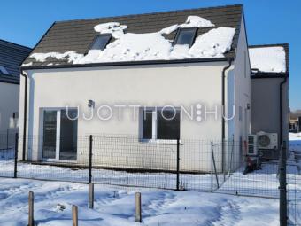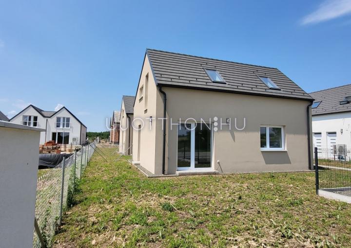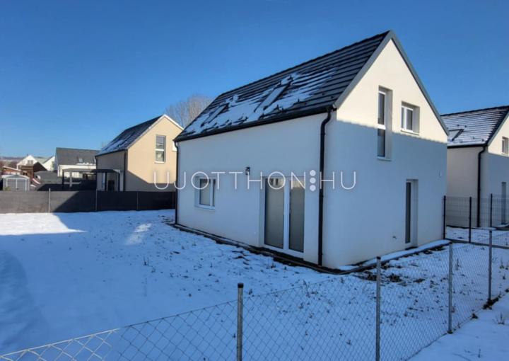 - 73 nm-es . Földszinten konyha-étkező, kertkapcsolatos nappali, tároló, fürdő+WC. Tetőtérben 2 háló , közlekedő, zuhanyzó+WC.