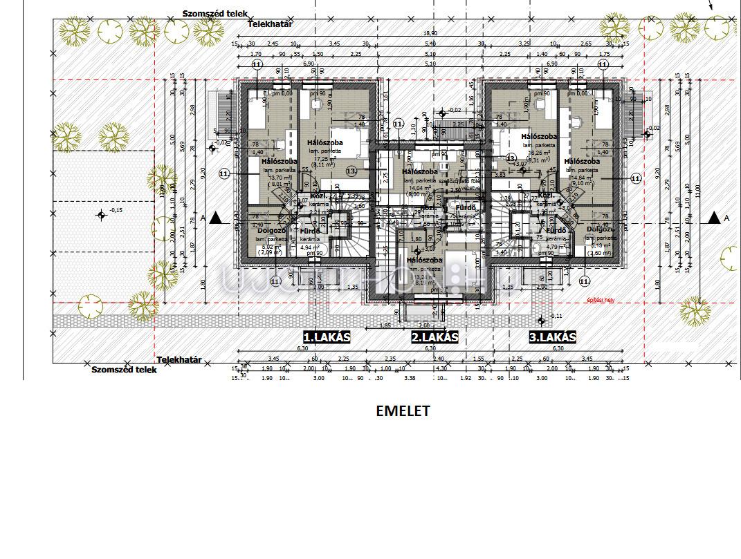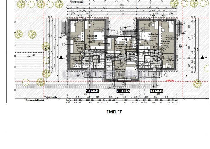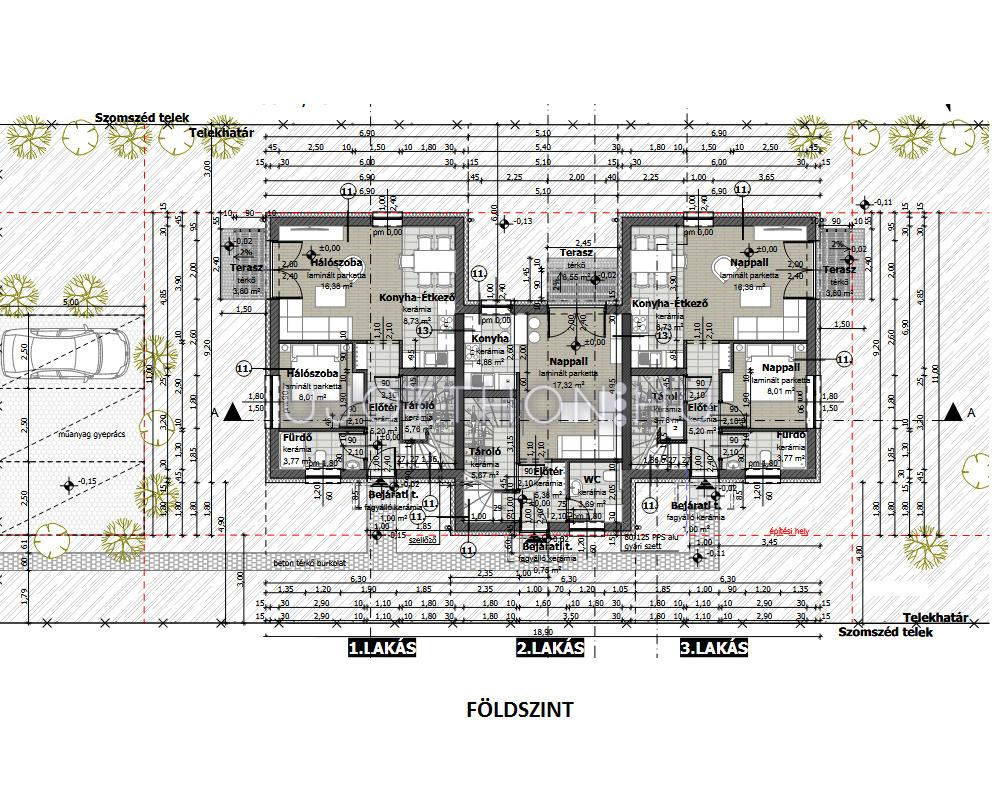 A 600-800 nm-es telken 3 db lakás található eltérő méretű saját használatú kerttel és kocsibeállóval.